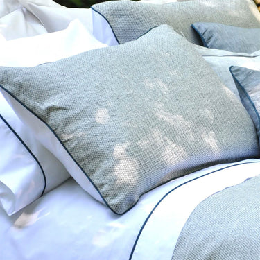 This sheet set includes a fitted sheet, a flat sheet, and two pillowcases. Featuring thick grosgrain ribbon piping on top of the flat sheet and thick grosgrain ribbon piping on one side of the pillowcases.