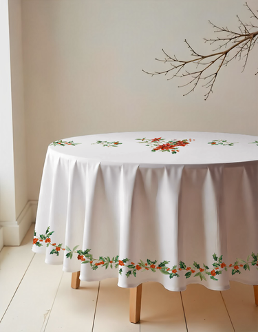 Expertly made in Portugal, this tablecloth is available in a wide range of round and rectangular sizes, as well as matching runners, making it easy to create a cohesive, festive look for any dining space. The crisp white backdrop and vibrant botanical accents add a polished, refined touch to your holiday décor.